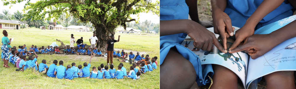 Sessão de educação ambiental e leitura do livro infantil Keita e os Golfinhos com alunos da Escola Primária Bilingue Governamental de Bamusso